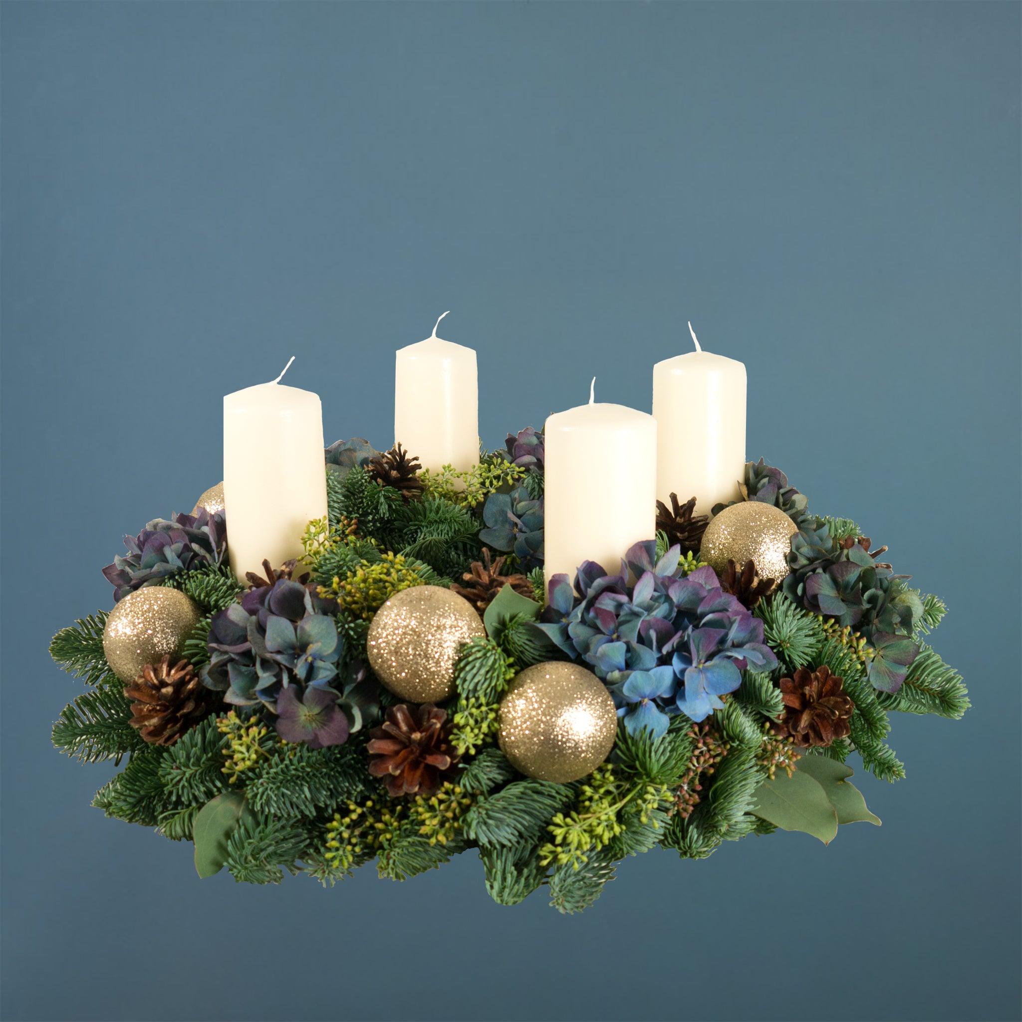 Luxurious handmade Advent wreath with cream candles and decorated with blue Hydrangea, gold bauble and natural pine cones.