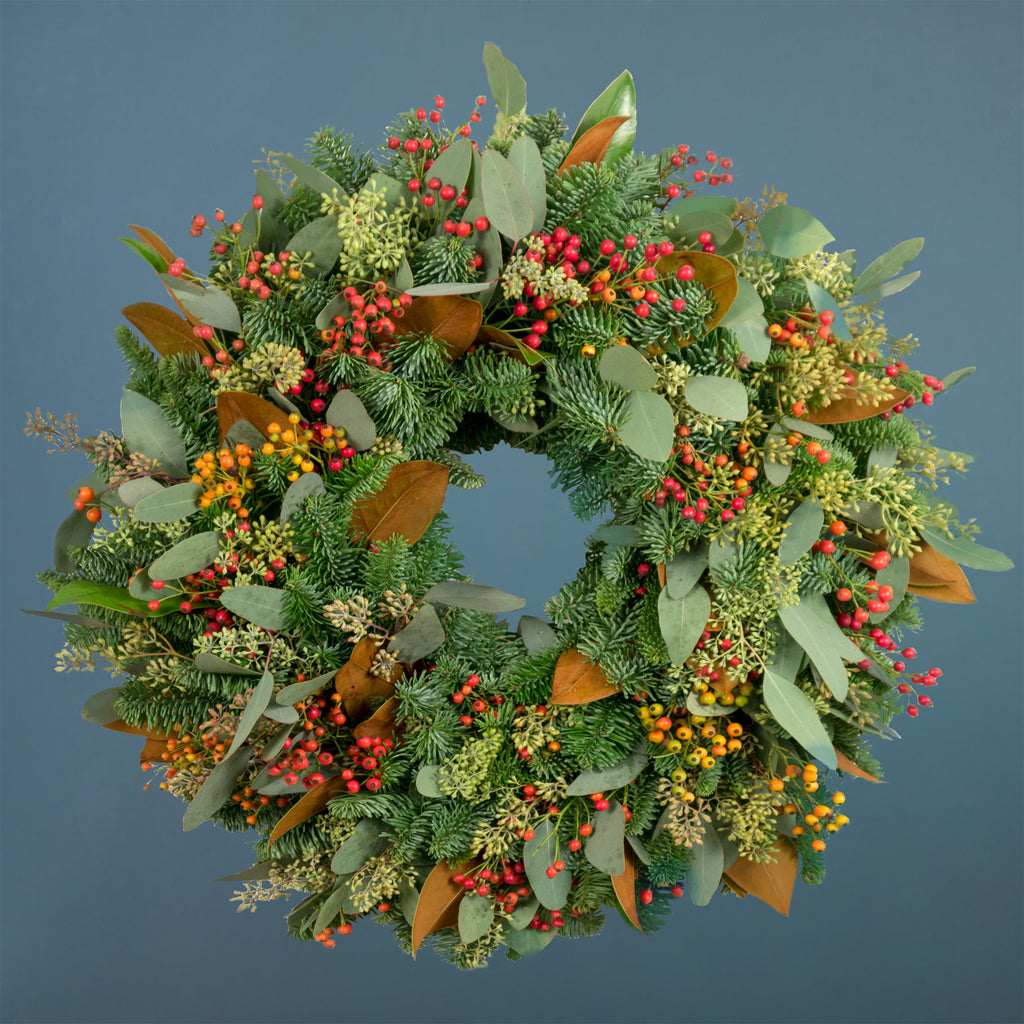 Vibrant red and orange Rosehips mingled with beautiful Magnolia foliage. The Rosehips and Magnolia Wreath is a unique design and very popular choice.